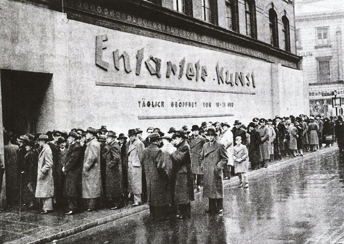 Le opere nella mostra inaugurata da Hitler nel 1937, a Monaco di Baviera erano accompagnate da scritte dispregiative e da elevatissime indicazioni di prezzo, costi che i musei avevano precedentemente pagato agli «speculatori ebrei». L’esposizione si proponeva di mostrare al pubblico quei generi artistici non ammessi dalla nuova «razza superiore», definiti appunto «degenerati».